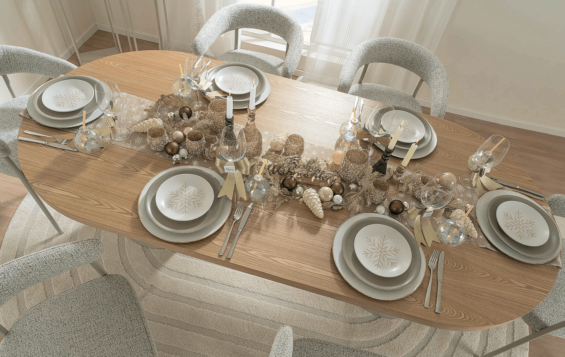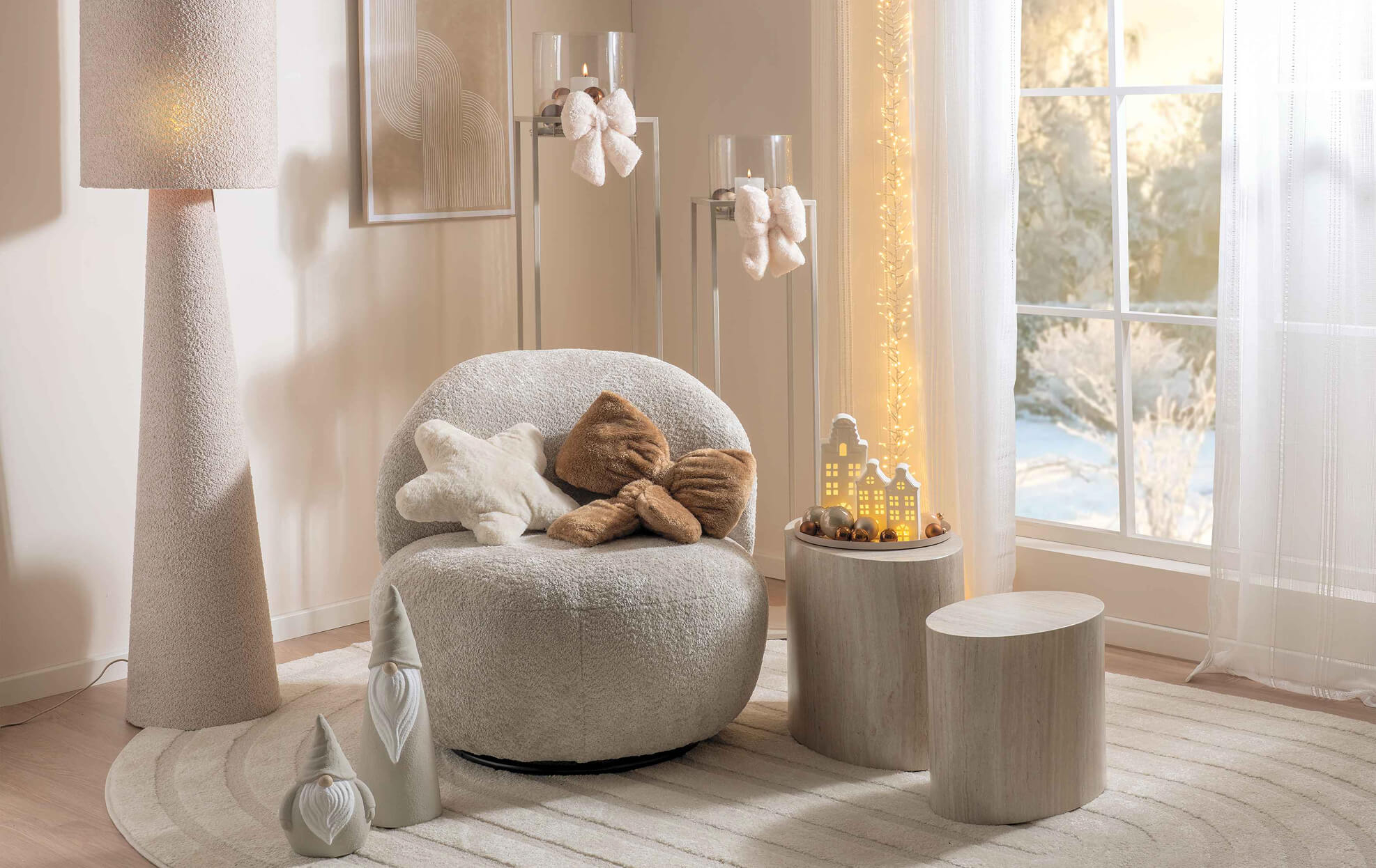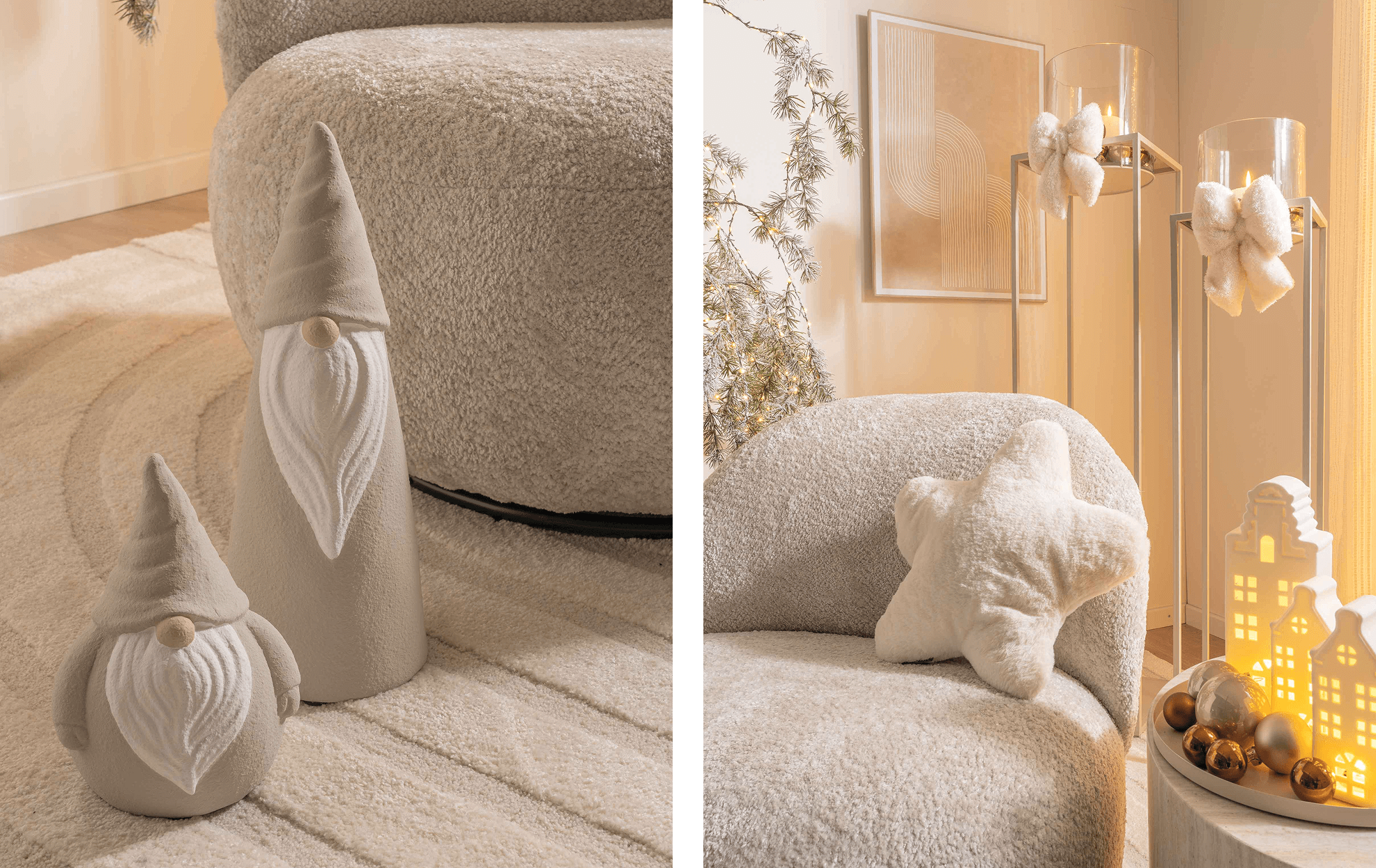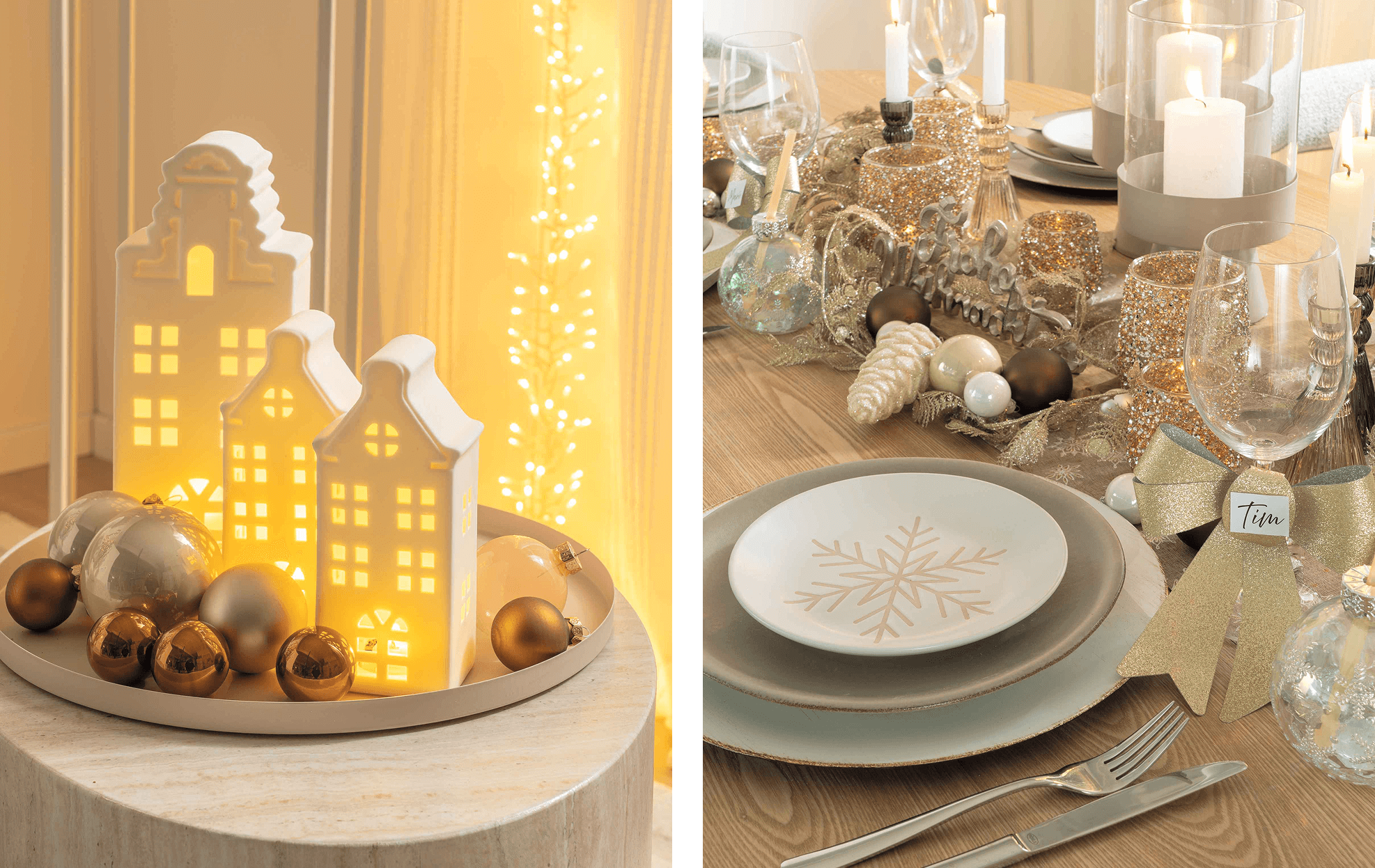 Der Weihnachtslook Greige Moments bringt Ruhe und schicken Minimalismus im Advent. Dezente Greige-Töne kombiniert mit silbernen Highlights sorgen für einen cleanen, modernen Look. Schlichte Eleganz mit Glam-Faktor.