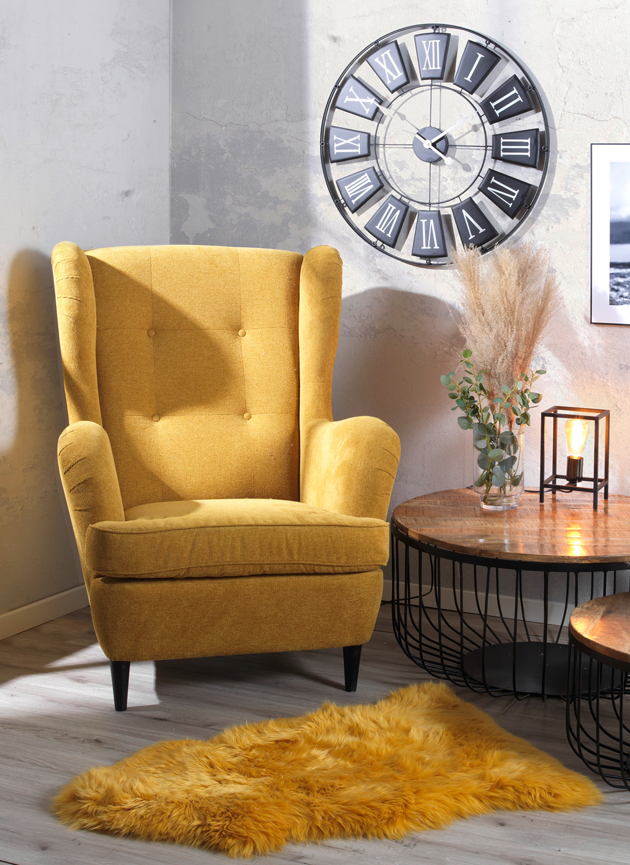 Ob Ohrensessel, Vorhänge oder Kissen – die intensiven Gelbtöne setzen gezielte Highlights und verleihen Deinem Wohnbereich eine stilvolle, herbstliche Note. Ein weiches Dekofell und ein passender Teppich machen den Look noch einladender und lassen sich individuell kombinieren.