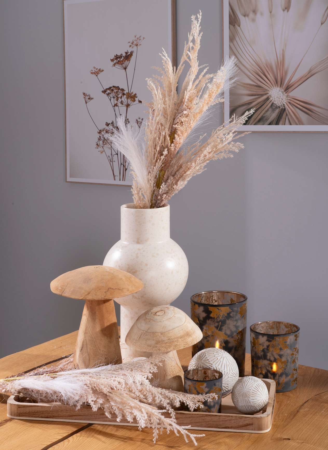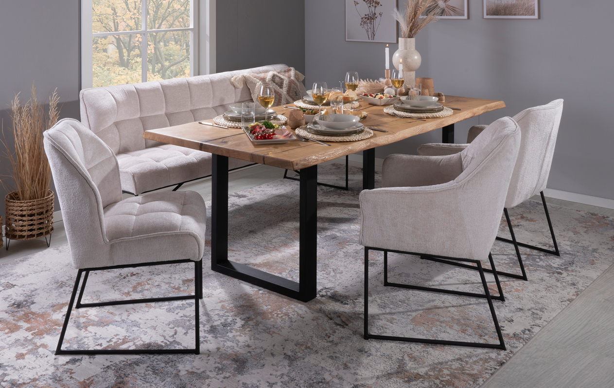 Der Mix aus warmen Cremefarben und natürlichen Materialien wie Holz und Cord schafft ein entspanntes Ambiente, das zum Verweilen einlädt. Ein großer Esstisch, gemütliche Sitzgelegenheiten, weichen Stoffe oder stylische Deko-Details – unser Look bringt rustikalen Flair in Dein Zuhause, ohne auf modernen Komfort und Style zu verzichten.
