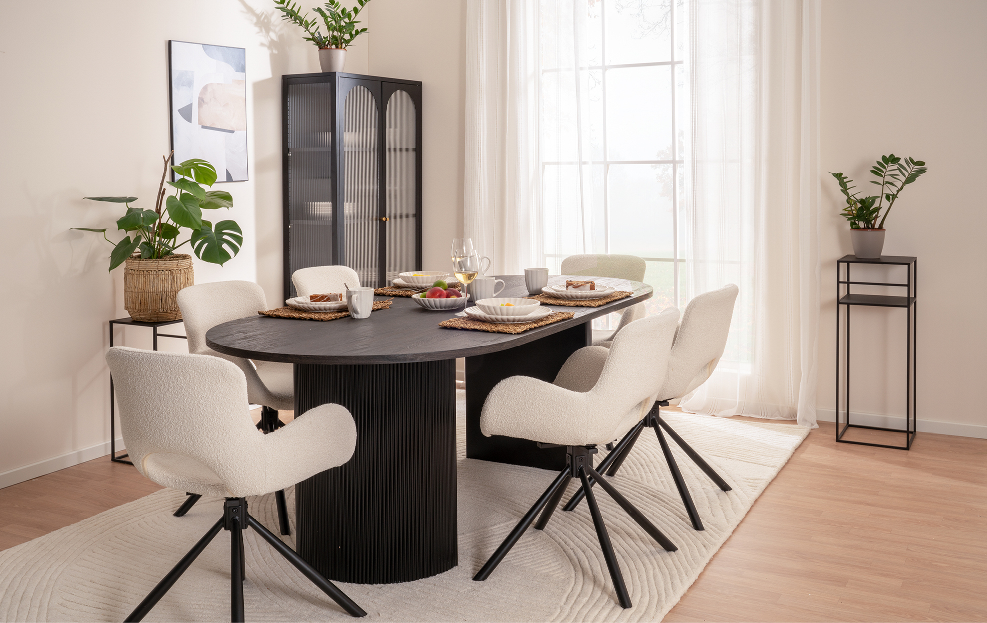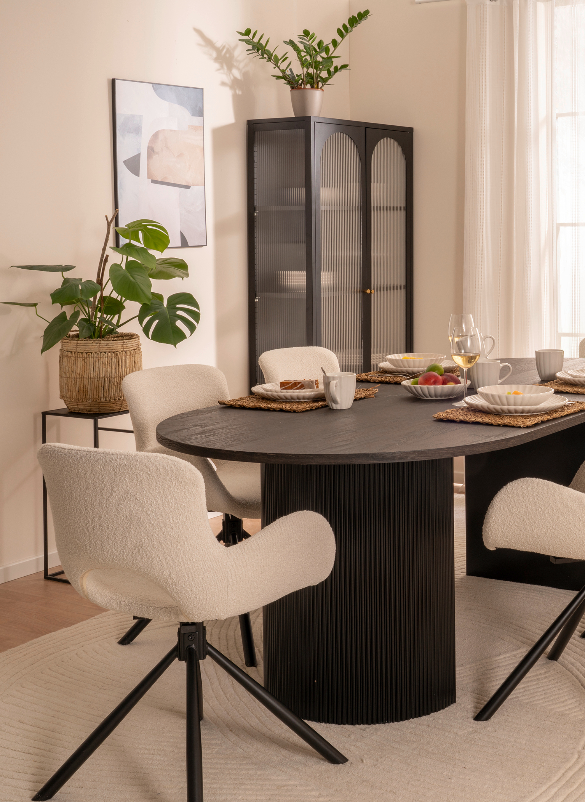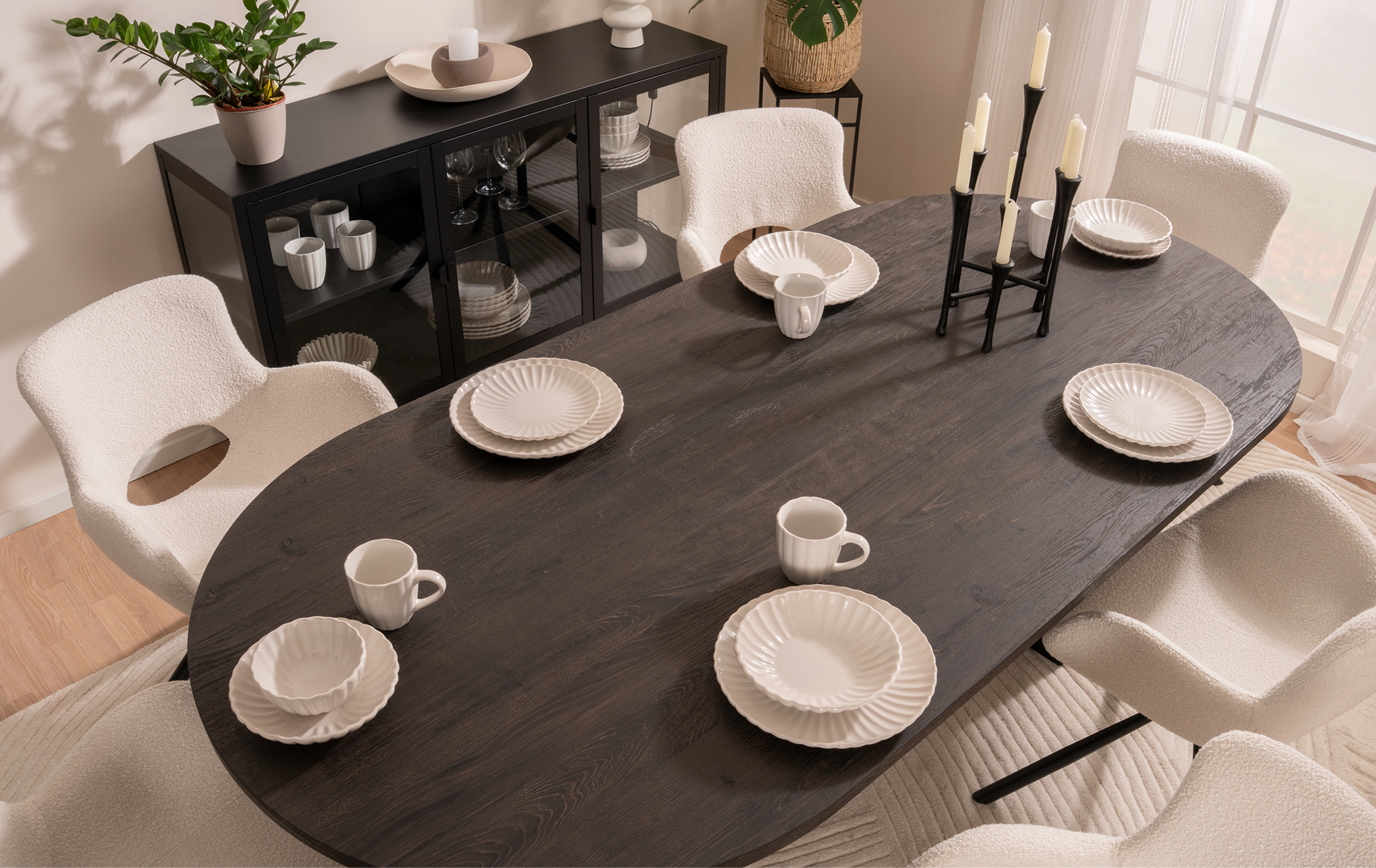Elegant-schwarze Möbel aus der House Nordic Kollektion liefern die markante Basis. Dagegen setzen helle Elemente im Teddy Look wie Sitzmöbel, Stühle, Teppiche oder Kissen einen kuscheligen Kontrapunkt. Der Stil lebt vom klaren Schwarz Weiß-Kontrast.